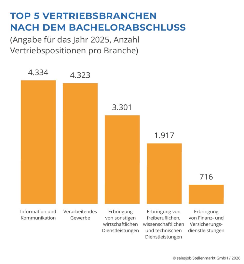 Mit mehr als 232.800 ausgeschriebenen Positionen bleibt die abgeschlossene Berufsausbildung der Vorreiter beim Berufseinstieg im Vertrieb. Besonders deutlich wird dies im Bereich der „sonstigen wirtschaftlichen Dienstleistungen“: In dieser Branche wurden über 101.700 Vertriebsjobs ausgeschrieben, und bei rund einem Drittel dieser Stellenangebote ist eine abgeschlossene Berufsausbildung explizit Voraussetzung. Geprägt wird dieses hohe Volumen maßgeblich durch Personaldienstleister, die aufgrund ihrer Geschäftsstruktur eine überproportional hohe Anzahl an Stellenanzeigen schalten. Im verarbeitenden Gewerbe macht der Ausbildungsabschluss mit rund 40.800 offenen Positionen (35,43 %) die zentrale Voraussetzung aus, im Finanz- und Versicherungssektor liegt die Zahl bei etwa 23.230 Stellen (44,13 %). Auch in der Informations- und Kommunikationsbranche setzen Unternehmen mit 19.600 offenen Positionen (22,43 %) auf Bewerber mit Berufsabschluss.