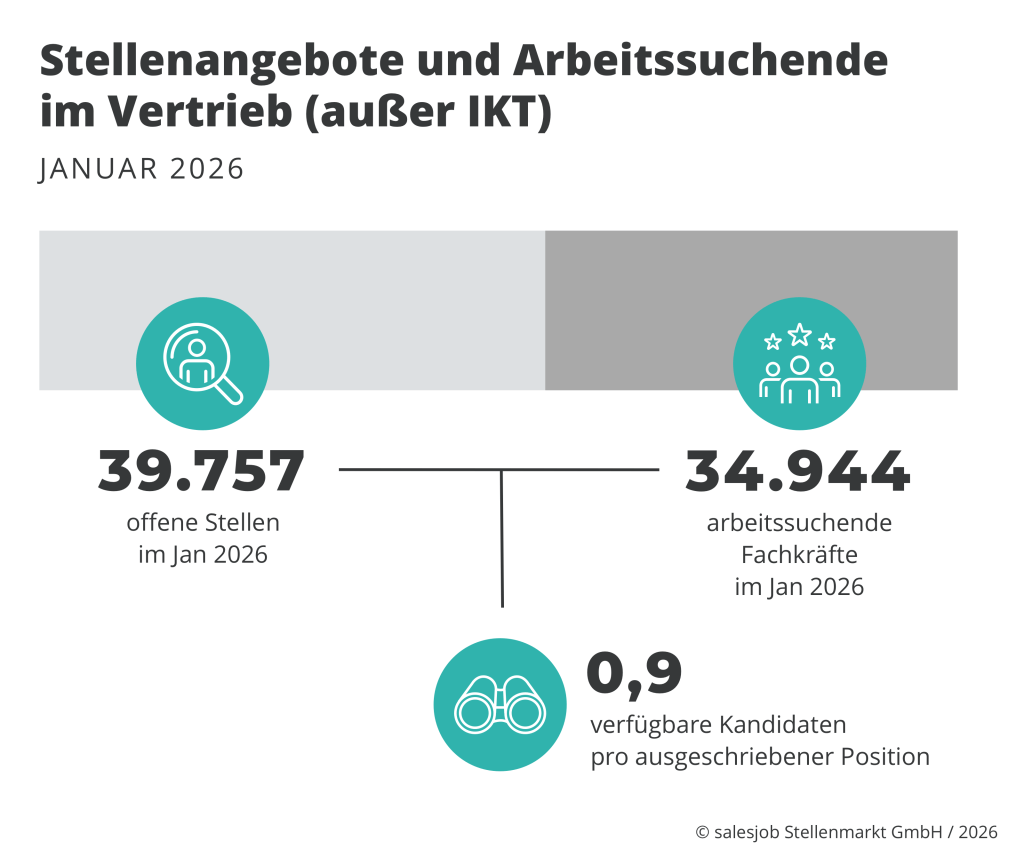 Berlin, 19. Februar 2026 – Der deutsche Arbeitsmarkt verzeichnet zum Jahresauftakt 2026 eine deutliche Trendumkehr im Vertrieb. Während die Zahl der Arbeitssuchenden im Vergleich zum Vorjahresmonat um 10,3 % zunimmt, sinkt das Volumen der ausgeschriebenen Stellen im selben Zeitraum um 12,3 %. Die aktuelle Auswertung der salesjob Stellenmarkt GmbH, basierend auf Daten der Bundesagentur für Arbeit sowie index Anzeigendaten, belegt die aktuellen Entwicklungen im deutschen Vertrieb.