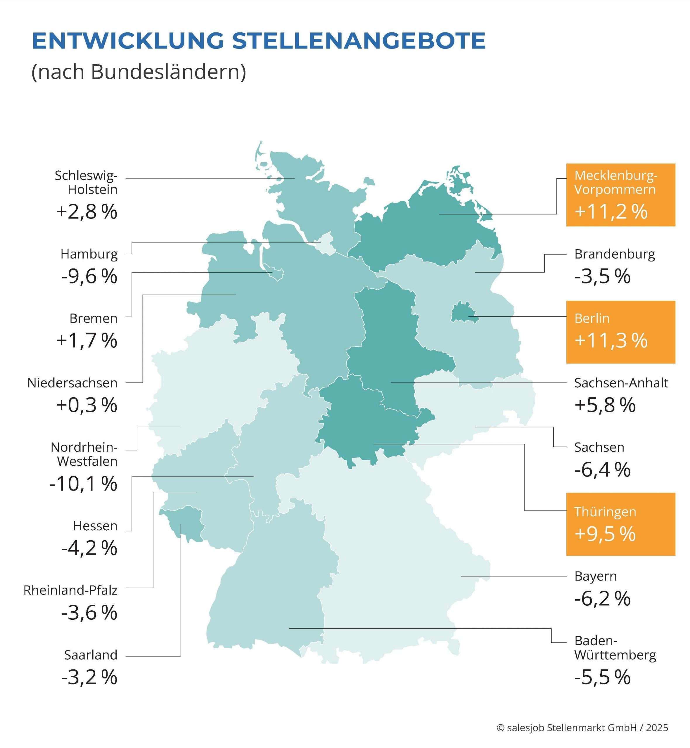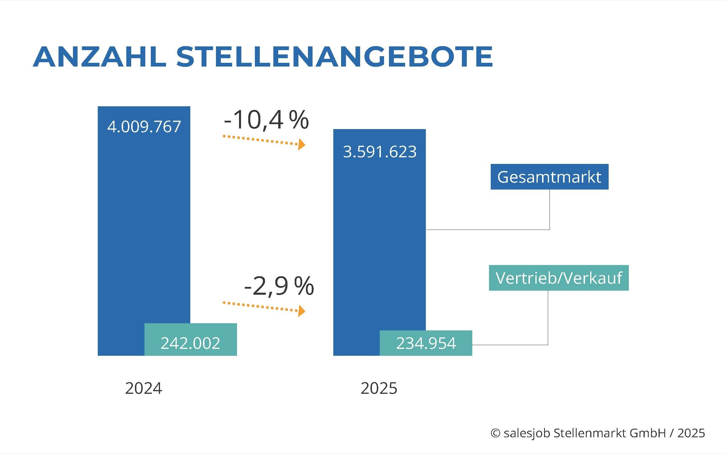 Berlin, der 21.10.2025 – Der deutsche Stellenmarkt hat im dritten Quartal 2025 weiter an Schwung verloren. Nach Angaben des aktuellen salesjob-Index sank die Zahl der ausgeschriebenen Positionen im Gesamtmarkt um 10,4 % gegenüber dem Vorjahresquartal auf rund 3.591.000 Stellen. Der Vertriebsbereich zeigt sich dagegen vergleichsweise widerstandsfähig: Mit etwas mehr als 234.950 ausgeschriebenen Positionen verzeichnete das Segment lediglich ein Minus von 2,9 %.