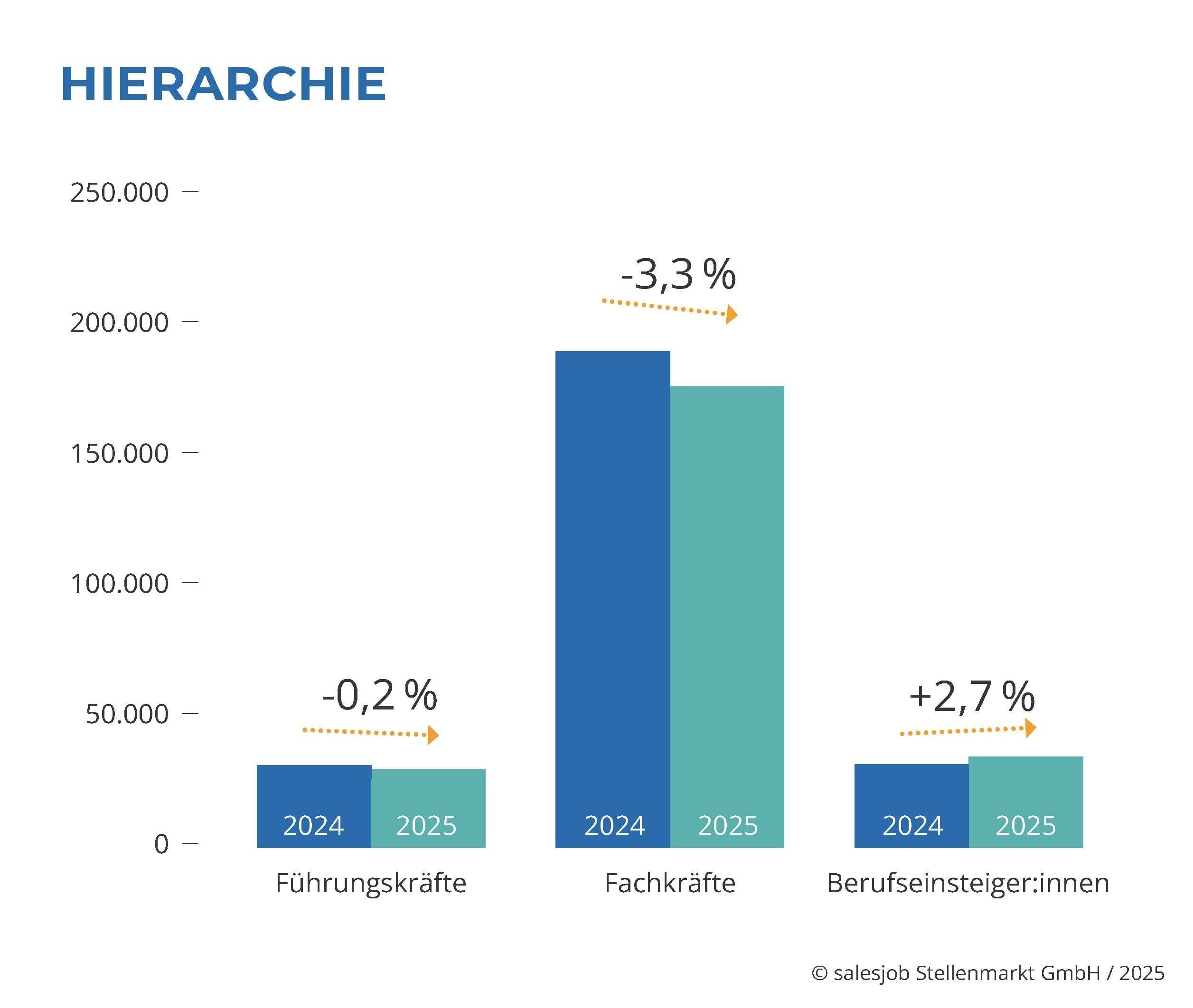 Während die Zahl der Ausschreibungen für Berufseinsteiger leicht um 2,7 % auf rund 28.500 Positionen anstieg, blieb der Markt für Führungskräfte nahezu stabil (-0,2 %; über 27.000 Stellen). Das größte Minus entfiel auf Fachkräfte, deren Nachfrage um 3,3 % auf gut 178.700 Positionen sank.