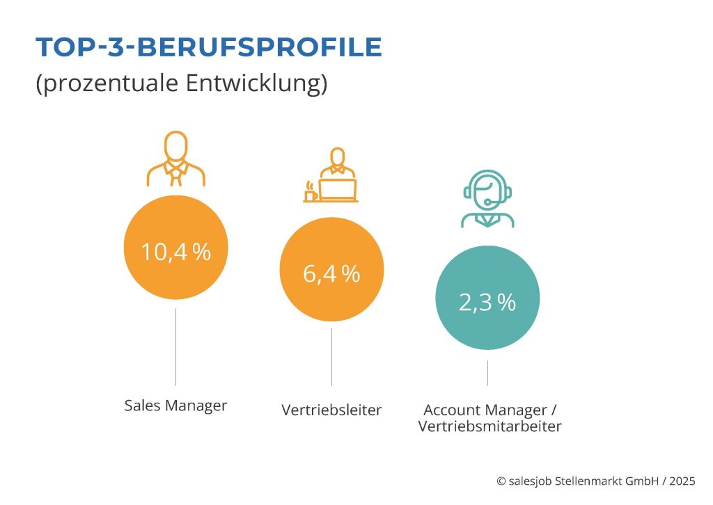 Die Analyse verschiedener Berufsprofile zeigt eine Verschiebung der Nachfrage. Besonders gefragt waren im Q3 2025 Sales Manager (+10,4 %), Vertriebsleiter (+6,4 %) und Account Manager (+2,3 %) – Profile, die stark auf strategische Kundenentwicklung und Umsatzverantwortung ausgerichtet sind. Demgegenüber verloren operative und administrative Vertriebsfunktionen deutlich an Relevanz: Vertriebsinnendienst (-15,6 %), Telesales (-31 %) und Vertriebsassistenz (-31,5 %) verzeichneten teils drastische Rückgänge. Die Zahlen spiegeln die zunehmende Automatisierung und Digitalisierung operativer Vertriebsprozesse wider.