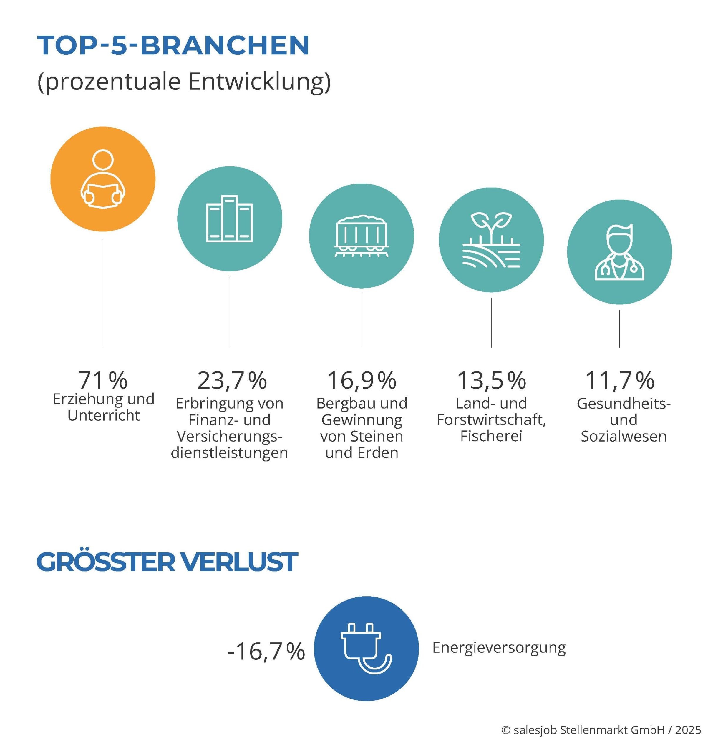 Trotz der insgesamt rückläufigen Entwicklung konnten einige Branchen im Jahresvergleich deutliche Zuwächse verzeichnen. Besonders stark fiel das Wachstum im Bereich Erziehung und Unterricht (+71 %) aus, gefolgt von Finanz- und Versicherungsdienstleistungen (+23,7 %) und dem Bergbau (+16,9 %). Auch die Land- und Forstwirtschaft (+13,5 %) sowie das Gesundheits- und Sozialwesen (+11,7 %) verzeichneten eine steigende Nachfrage nach Fachkräften. Dem gegenüber standen deutliche Einbrüche in kultur- und energiebezogenen Branchen: Kunst, Unterhaltung und Erholung (-14,6 %), Wasserversorgung (-16,4 %) sowie Energieversorgung (-16,7 %) verloren spürbar an Stellenvolumen.