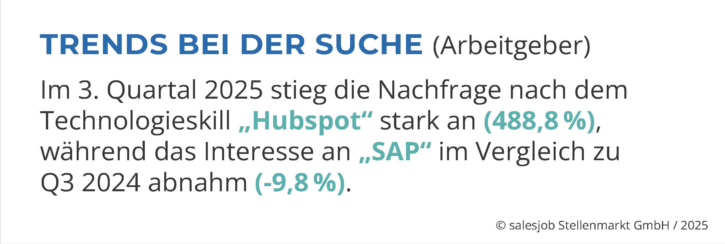 Parallel dazu wächst der Bedarf an technologischen Fähigkeiten. Im dritten Quartal 2025 verzeichnete die Zahl der Ausschreibungen mit Bezug zu Hubspot (+488,8 %), Salesforce (+173,3 %) und CRM-Systemen allgemein (+104,7 %) einen sprunghaften Anstieg. Auch Microsoft Excel blieb mit einem leichten Plus von 0,3 % stabil. Lediglich die Forderung nach SAP-Kenntnissen gingen um 9,8 % zurück.