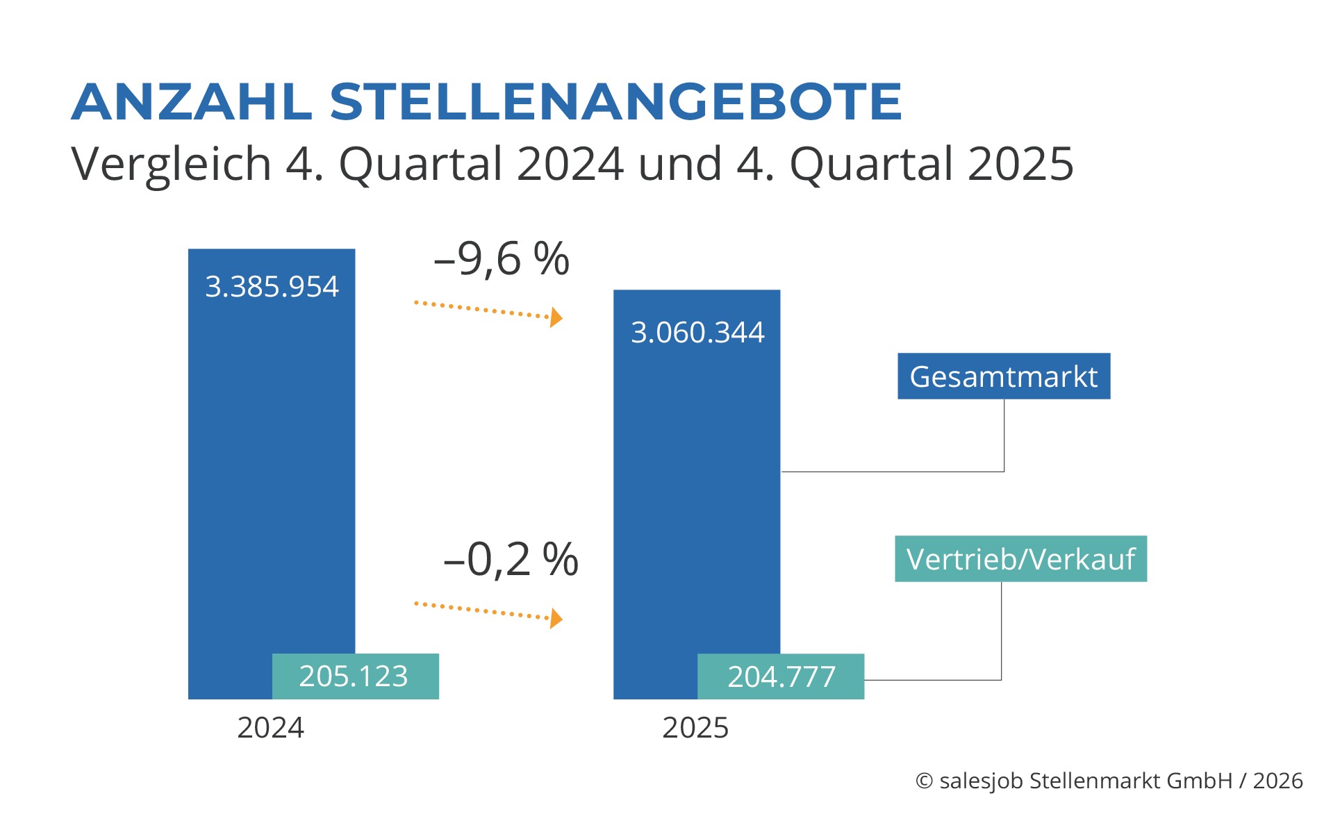 Berlin, der 04.02.2026 – Der deutsche Arbeitsmarkt verzeichnet für das vierte Quartal 2025 einen Rückgang der ausgeschriebenen Stellen auf dem Gesamtstellenmarkt auf rund 3.060.350 Positionen, was einem Minus von 9,6 % gegenüber dem Vorjahresquartal entspricht. Der Vertriebsmarkt zeigt sich mit knapp 204.780 ausgeschriebenen Stellen stabil und verzeichnet lediglich einen Rückgang von 0,2 %. Der Vertrieb bleibt somit ein beständiger und verlässlicher Bereich in einem insgesamt rückläufigen Stellenmarkt.