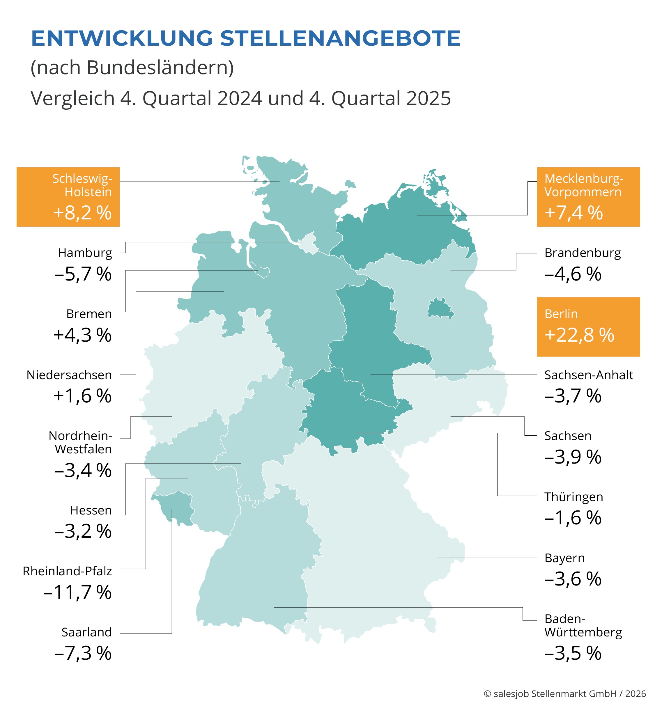Auch auf regionaler Ebene zeigen sich deutliche Unterschiede. Berlin verzeichnete mit 22,8 % das stärkste Wachstum im Vertriebsbereich, gefolgt von Schleswig-Holstein und Mecklenburg-Vorpommern. Demgegenüber gingen die Stellenangebote in Rheinland-Pfalz um 11,7 % zurück, auch das Saarland und Hamburg wiesen rückläufige Tendenzen auf. Insgesamt zeigt sich ein Trend zu verstärkten Wachstumsimpulsen in urbanen Zentren und ostdeutschen Bundesländern.