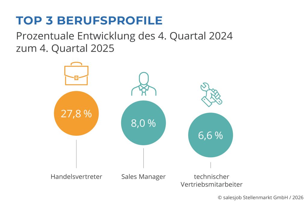 Für Berufseinsteiger stieg die Zahl der ausgeschriebenen Stellen im vierten Quartal 2025 um 8,5 % auf über 24.460 Positionen. Bei Führungskräften nahm die Nachfrage um 3,1 % auf knapp 23.760 Stellen zu. Die Positionen für Fachkräfte verzeichneten hingegen einen Rückgang um 8,2 % auf knapp 145.600 Positionen, was die wachsende Bedeutung von Nachwuchs- und strategischen Rollen im Vertrieb unterstreicht.