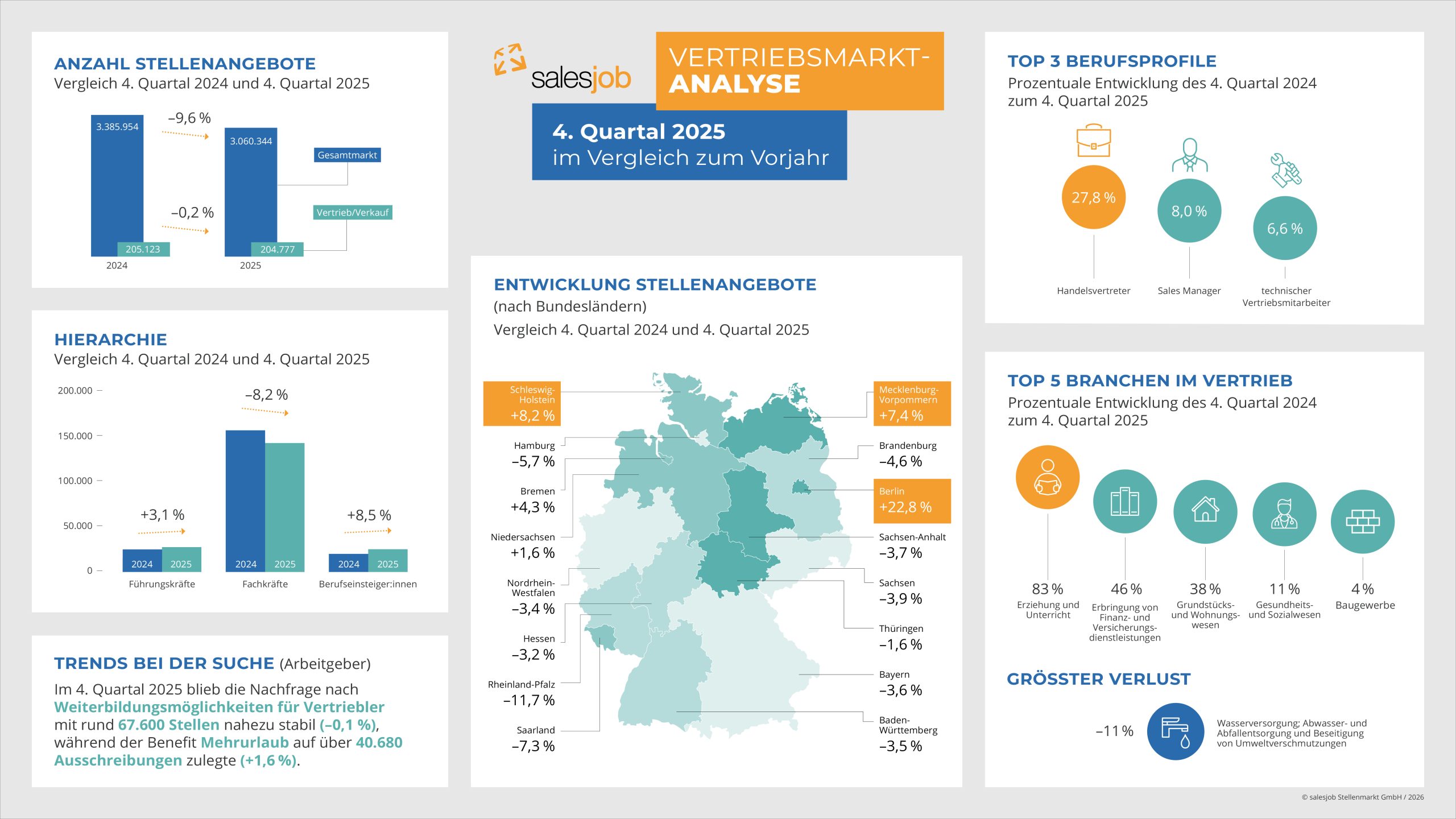 Berlin, der 04.02.2026 – Der deutsche Arbeitsmarkt verzeichnet für das vierte Quartal 2025 einen Rückgang der ausgeschriebenen Stellen auf dem Gesamtstellenmarkt auf rund 3.060.350 Positionen, was einem Minus von 9,6 % gegenüber dem Vorjahresquartal entspricht. Der Vertriebsmarkt zeigt sich mit knapp 204.780 ausgeschriebenen Stellen stabil und verzeichnet lediglich einen Rückgang von 0,2 %. Der Vertrieb bleibt somit ein beständiger und verlässlicher Bereich in einem insgesamt rückläufigen Stellenmarkt.