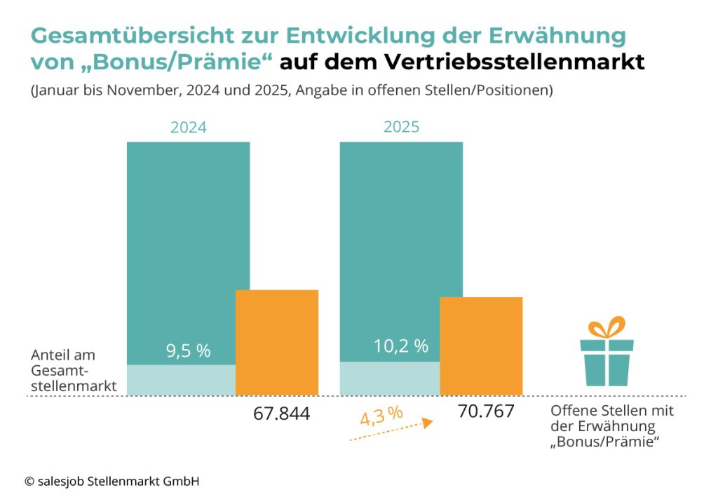 Eine gegenläufige Entwicklung zeigt sich bei leistungsbezogenen Vergütungsmodellen. Während der Gesamtstellenmarkt bei Bonus- und Prämienzahlungen einen leichten Rückgang von 2,8 % verzeichnete (von über 921.320 auf 895.100 Stellen), gewinnen diese im Vertrieb weiter an Bedeutung. Die Zahl der ausgeschriebenen Vertriebsstellen mit Bonus- oder Prämienmodellen stieg von rund 67.840 im Jahr 2024 auf knapp 70.770 im Jahr 2025 (+4,3 %).