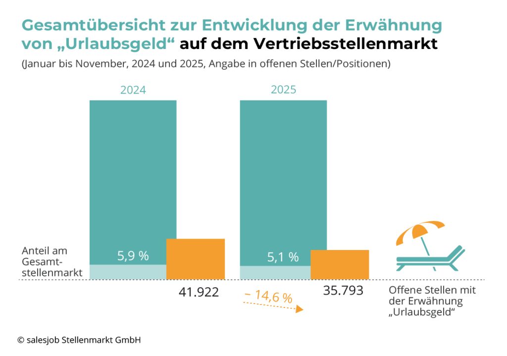 Berlin, der 14.01.2026 – Der deutsche Gesamtstellenmarkt zeigt eine deutliche Verschiebung bei der Kommunikation von Zusatzleistungen. Während die Nennung von Urlaubsgeld im Gesamtmarkt massiv einbrach (-19,8 %), verzeichnet der Vertrieb eine spezifischere Dynamik: Hier gewannen leistungsbezogene Bonusmodelle entgegen dem Markttrend mit einem Plus von 4,3 % an Bedeutung. Eine aktuelle Marktanalyse von salesjob Stellenmarkt GmbH belegt den Trend weg von pauschalen Sonderzahlungen hin zu variablen Anreizen.